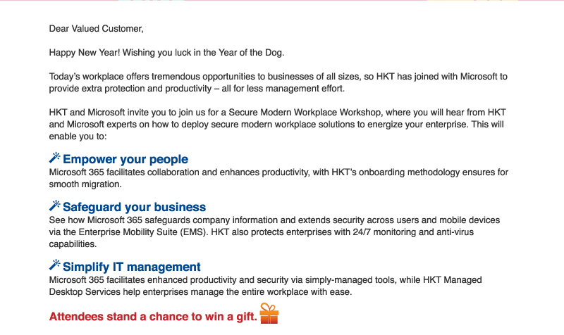 Hong Kong Telecommunications (HKT) Limited, 26/F PCCW Tower, Taikoo Place, Quarry Bay, Hong Kong, tel 3516-8493, email address info_enterprisecloud@pccw.com. If you do not wish to receive further email messages from Hong Kong Telecommunications (HKT) Limited, please email to unsubscribe@pccw.com.